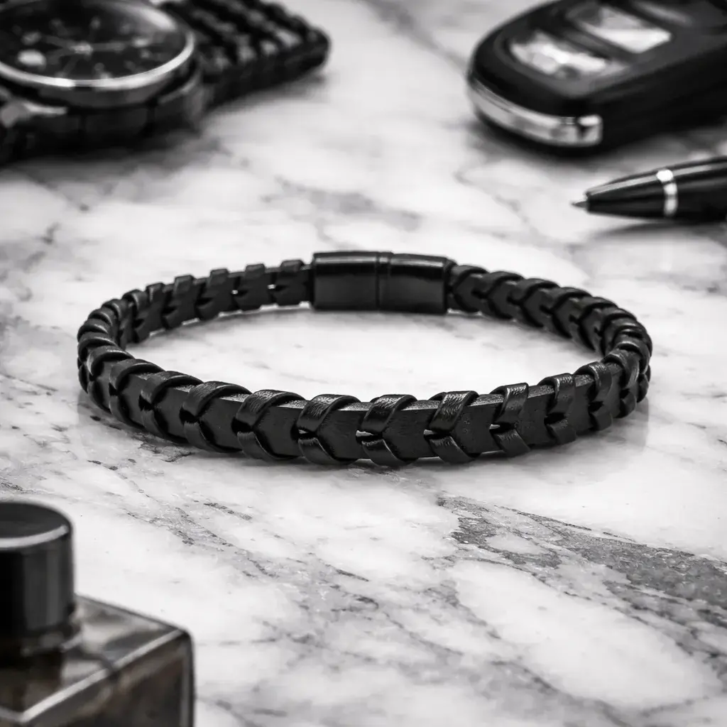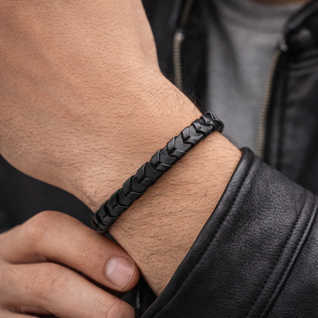 Pulsera negra de piel con diseño tejido tipo flecha, pensada para quienes buscan un accesorio con estilo sobrio, moderno y fácil de combinar. Su acabado liso con trenzado marcado aporta personalidad sin verse exagerado, por lo que funciona muy bien con looks casuales, urbanos o de inspiración masculina.
