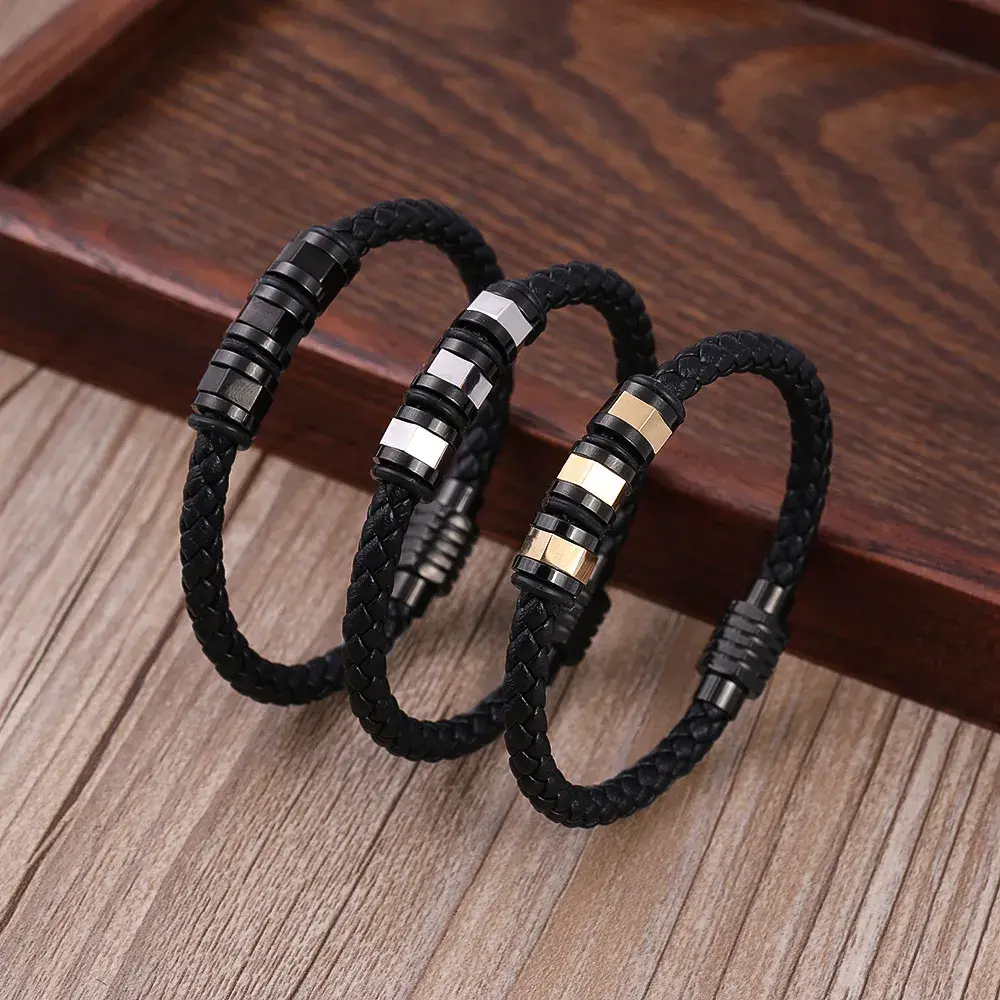 La piel tejida de alta calidad ofrece una sensación de comodidad y flexibilidad, adaptándose perfectamente a la muñeca y proporcionando un ajuste seguro para el uso diario. Los detalles de acero inoxidable en las cuentas tipo tuercas garantizan durabilidad y resistencia a la corrosión, manteniendo el brillo y la apariencia impecable de la pulsera con el paso del tiempo. Este accesorio es ideal para complementar tanto atuendos casuales como más formales, añadiendo un toque de modernidad y originalidad.