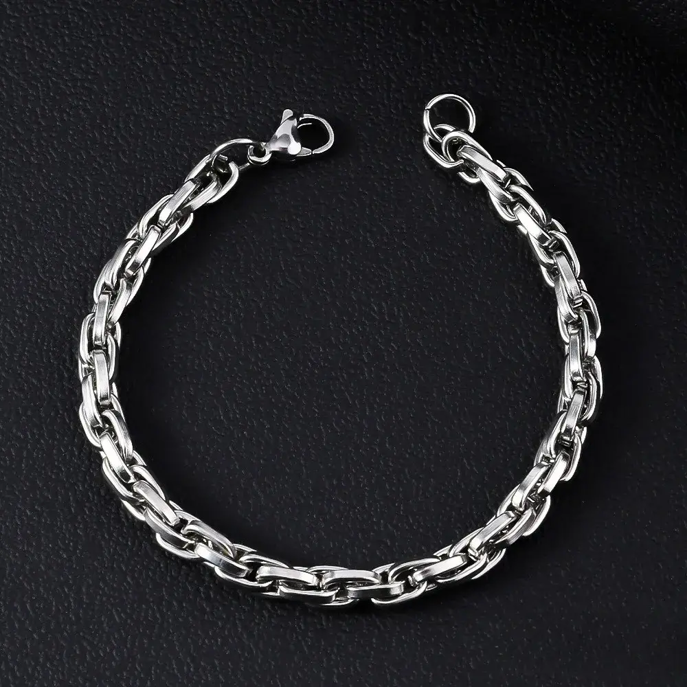 El diseño entrelazado da un acabado más limpio y ordenado que una cadena común, por eso funciona muy bien como pieza de diario o como regalo para alguien de estilo clásico y práctico. Además de verse bien, ofrece beneficios reales al comprar: el acero inoxidable es hipoalergénico, resistente al agua y conserva mejor su apariencia frente al uso frecuente. Es una opción funcional para quien busca una pulsera durable, fácil de combinar y con imagen firme. Agrégala a tu carrito y úsala como básico para elevar cualquier look masculino.