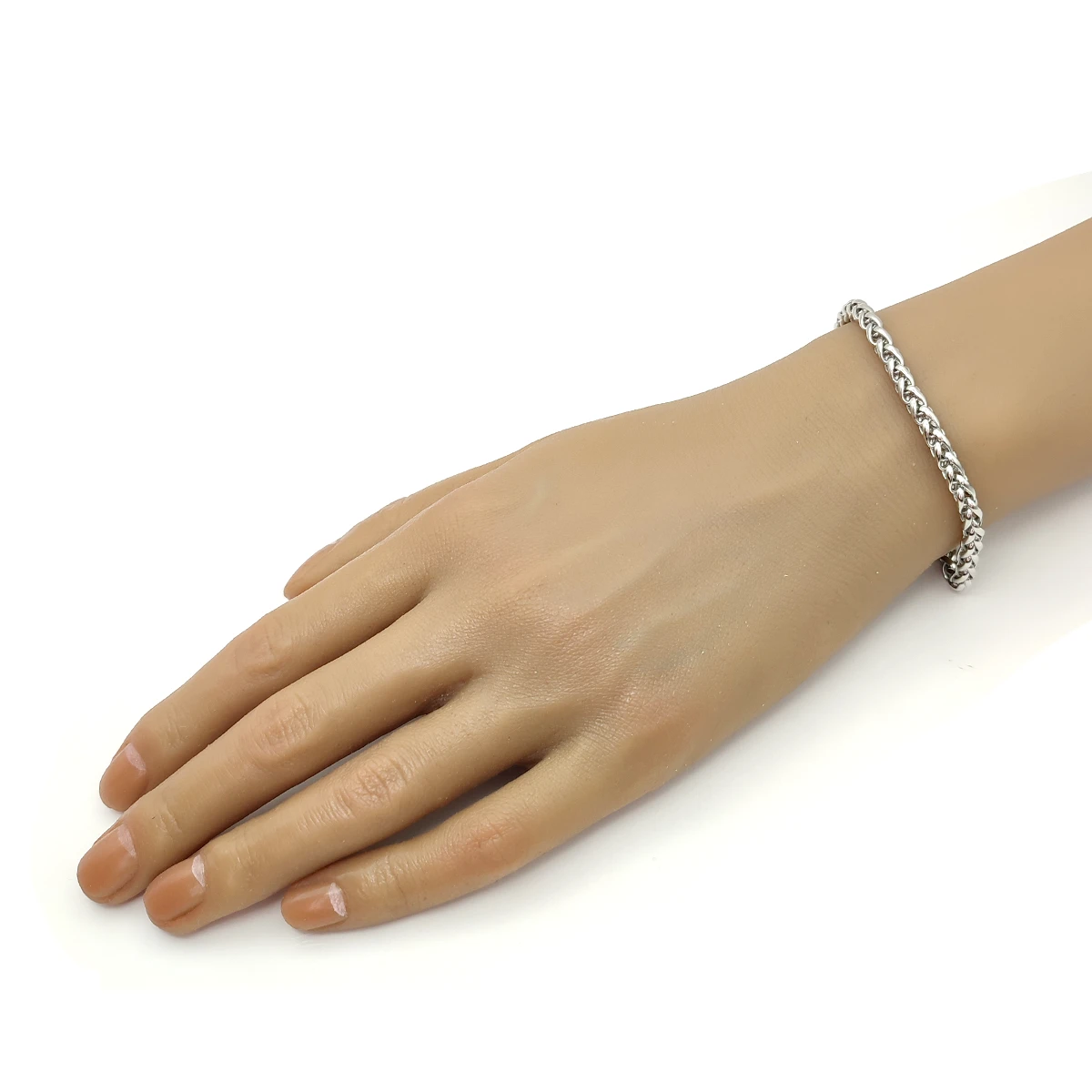 Fabricada en acero inoxidable de alta calidad, esta pulsera es resistente a la corrosión y al desgaste, asegurando que su brillo y acabado plateado se mantengan impecables con el uso prolongado. Es una opción ideal para quienes valoran la durabilidad y el estilo en una sola pieza.
