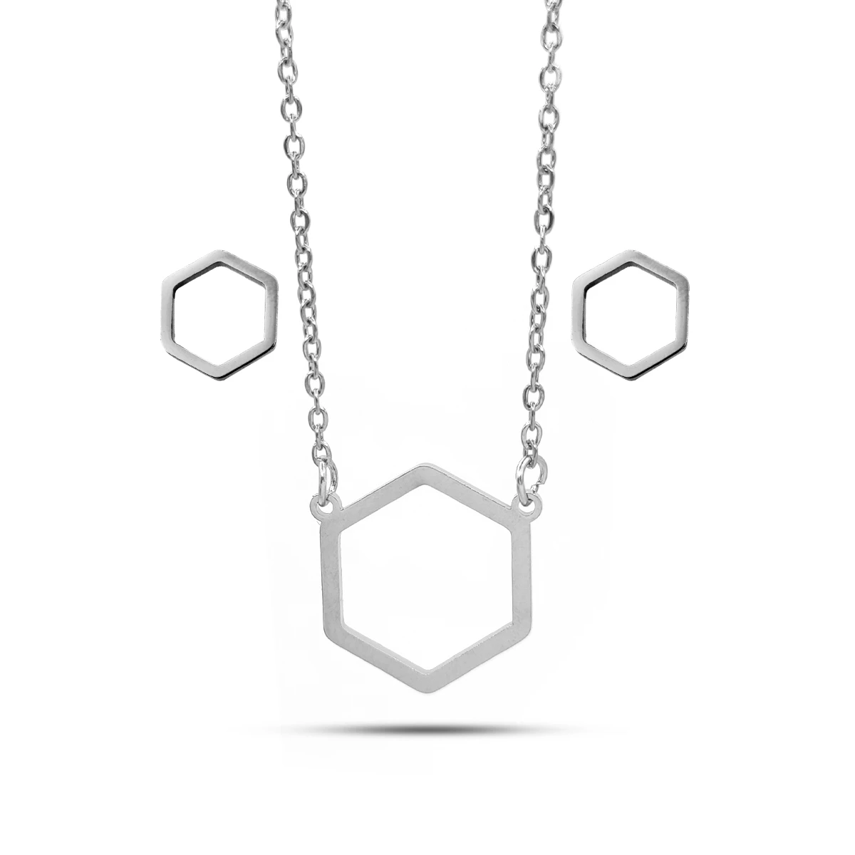 El contorno hexagonal aporta un equilibrio perfecto entre minimalismo y originalidad, convirtiendo a este set en una elección ideal para quienes buscan accesorios que resalten sin ser demasiado llamativos. El collar presenta una delicada cadena que asegura comodidad y un ajuste perfecto, mientras que los aretes de diseño compacto ofrecen un toque sutil de sofisticación.