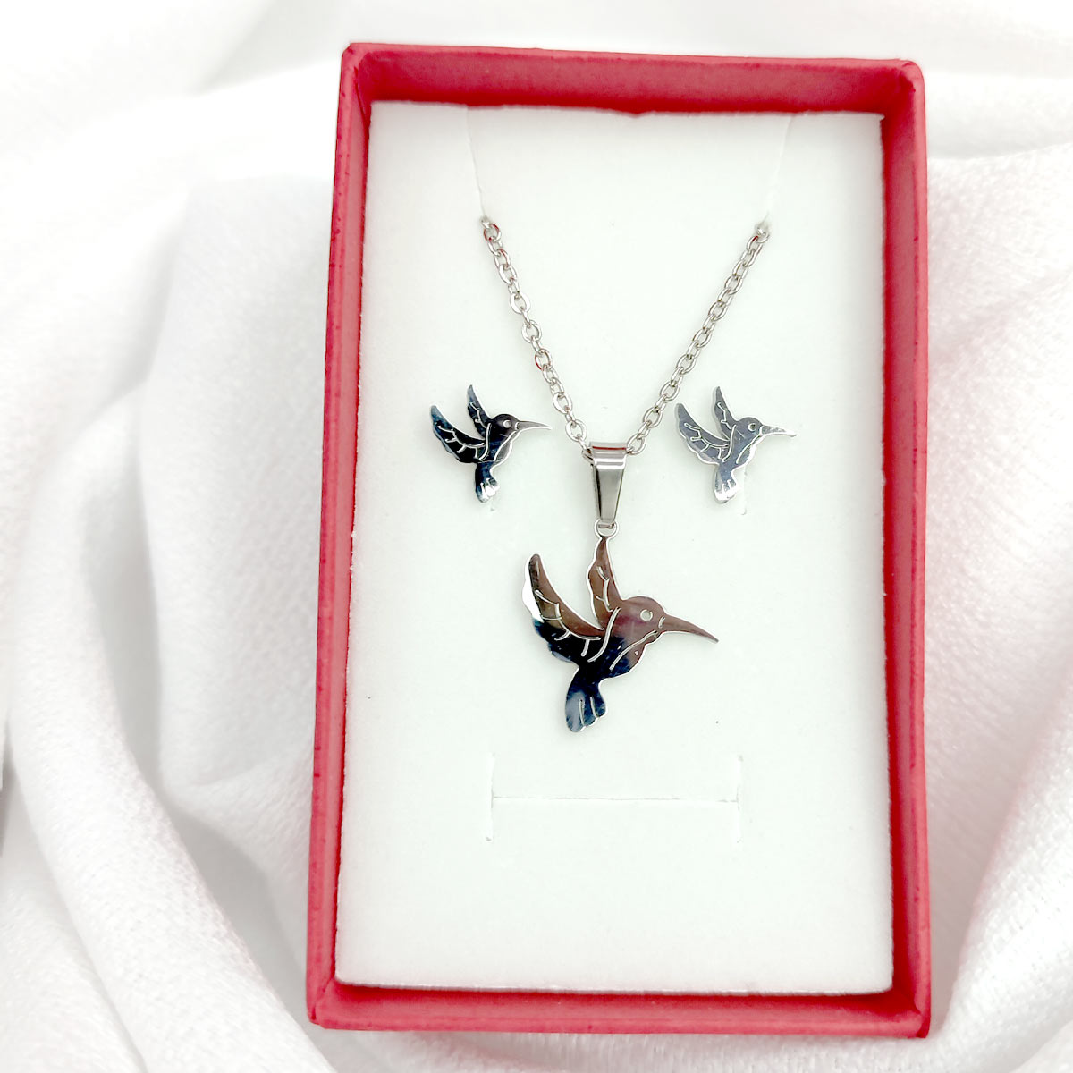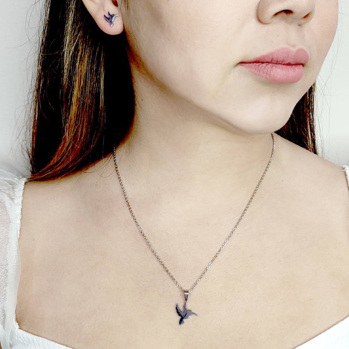 Nuestro “Set Joyería Acero Inox Plateado Hermoso Colibrí 16 mm” captura la esencia de esta majestuosa ave en una pieza de joyería única y elegante. Al usar nuestro set de joyería, te sentirás empoderada y radiante, como el colibrí que vuela con gracia y velocidad.