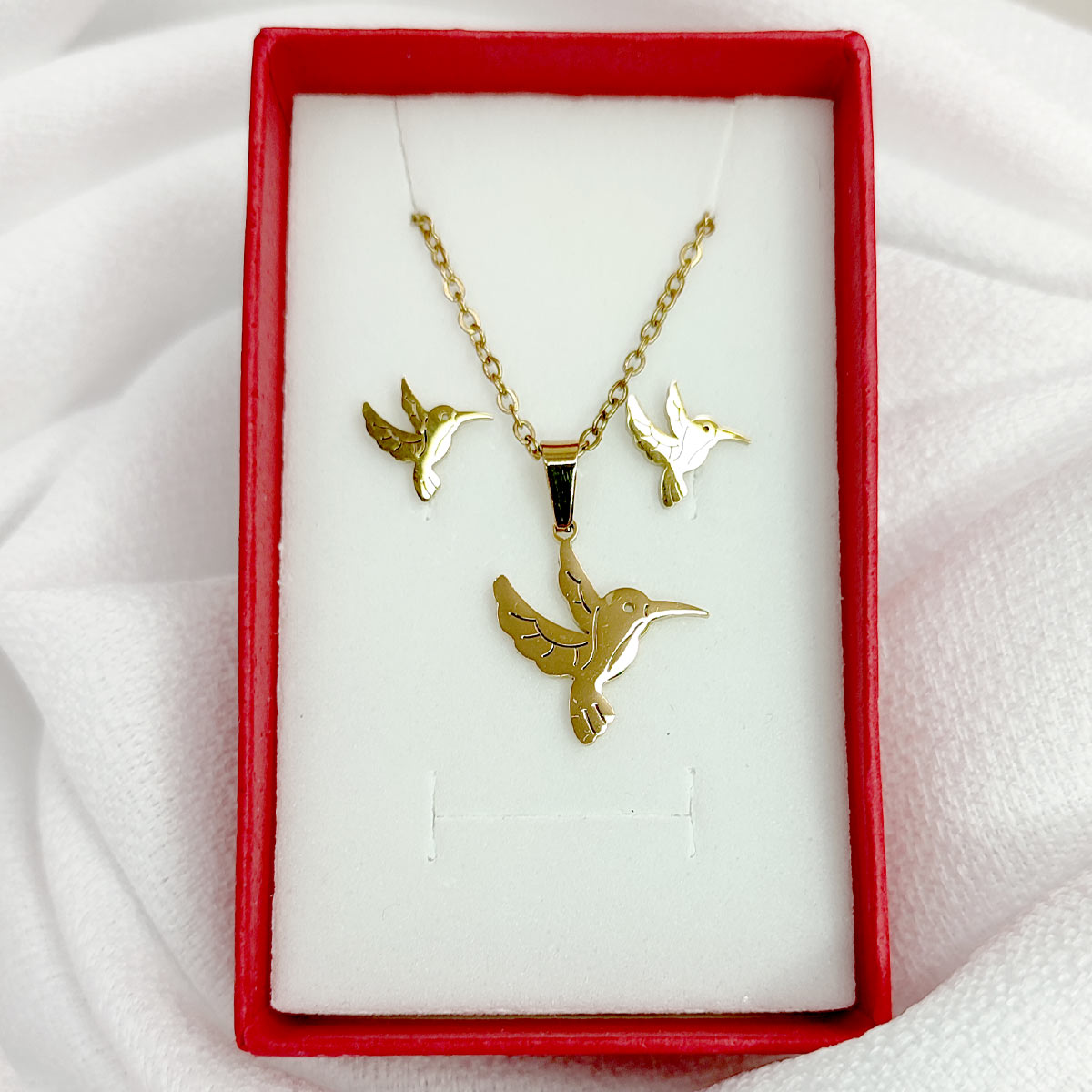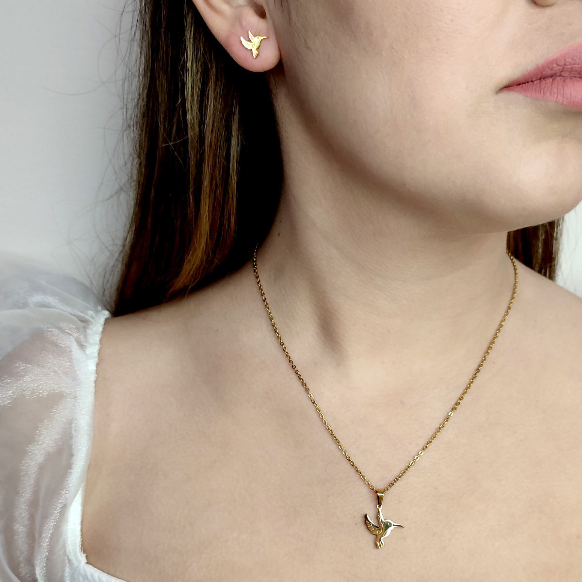 Nuestro “Set Joyería Acero Inox dorado Hermoso Colibrí 16 mm” captura la esencia de esta majestuosa ave en una pieza de joyería única y elegante. Al usar nuestro set de joyería, te sentirás empoderada y radiante, como el colibrí que vuela con gracia y velocidad.