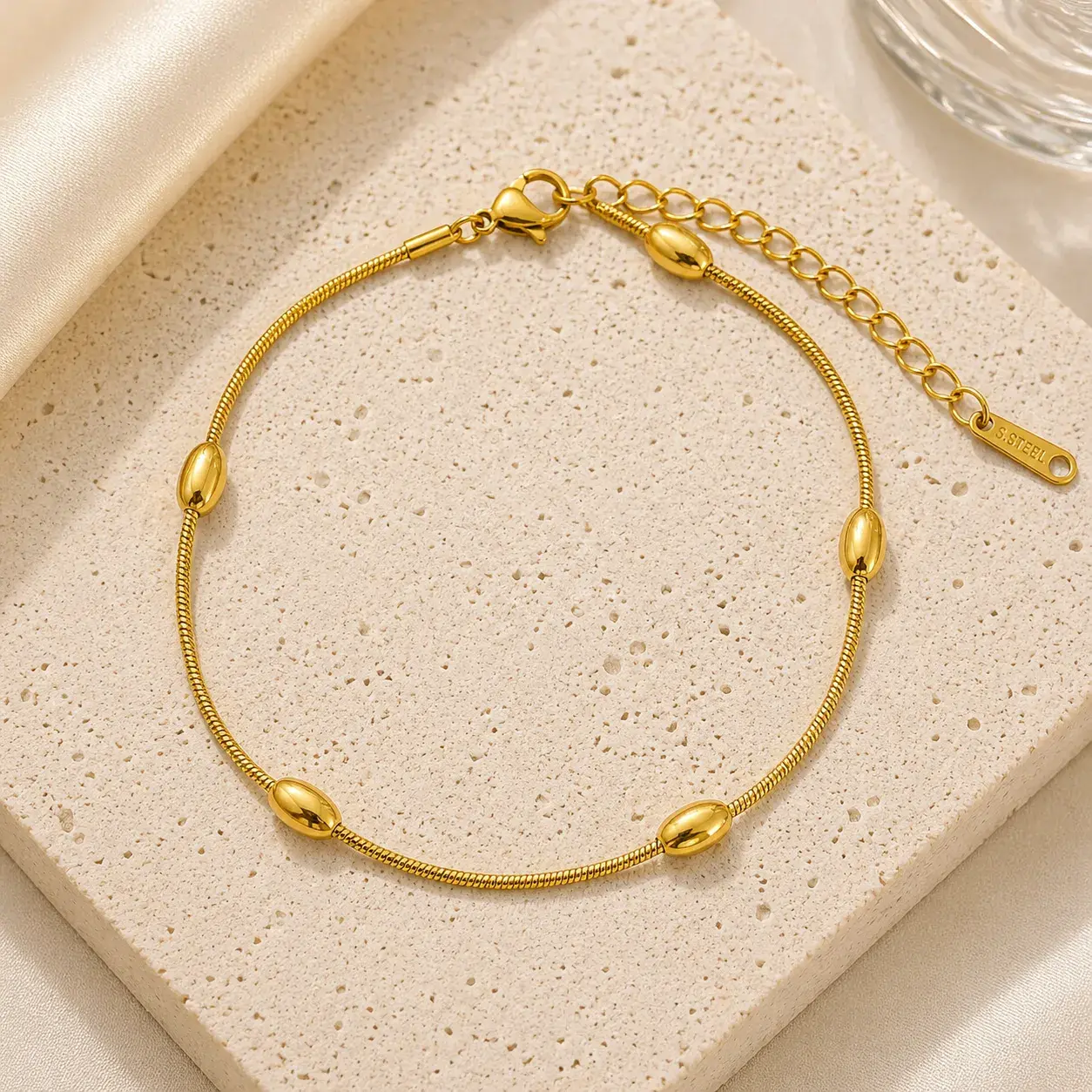 Tobillera dorada tipo cola de rata con detalles de barriles, ideal para quienes buscan un accesorio fino, discreto y fácil de combinar todos los días. Su diseño delgado aporta un brillo sutil que luce perfecto con sandalias, tenis, flats o incluso descalza en looks de playa. Es una excelente opción para uso diario, vacaciones, salidas casuales, caminatas, fines de semana o para complementar outfits minimalistas sin recargar el estilo.